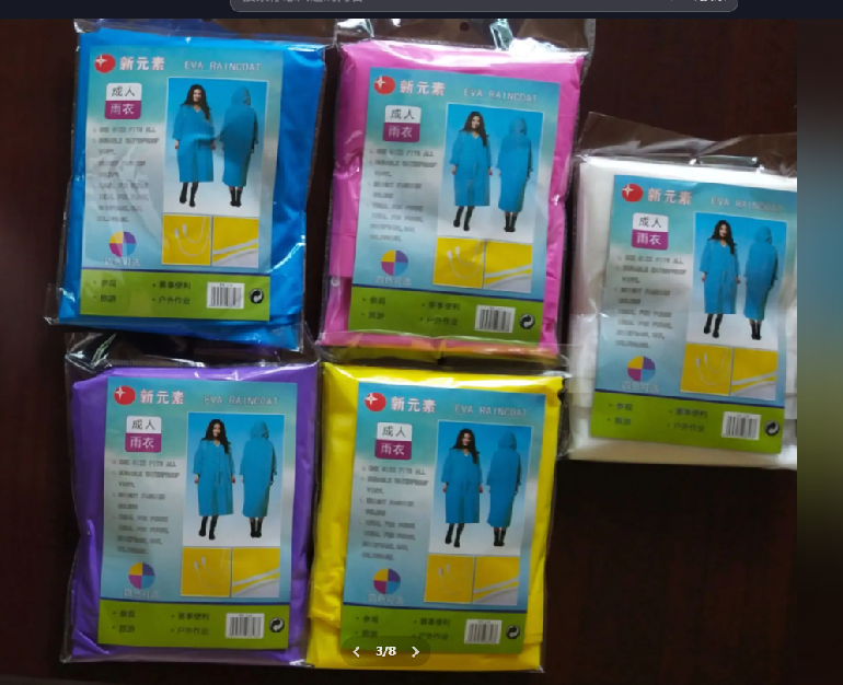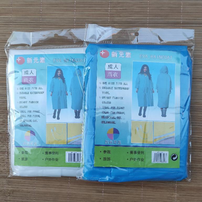 包装袋上面写着4色可选,实际上5个颜色,多了一个白色,如下图 成人EVA雨衣白/黄/粉/蓝/紫5色可选128g;