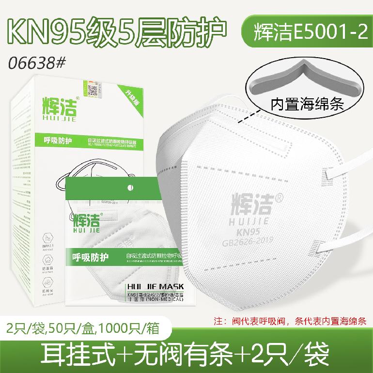 辉洁E5001-2耳挂式.无阀5层★kn95白色口罩★2只/装(有内条)