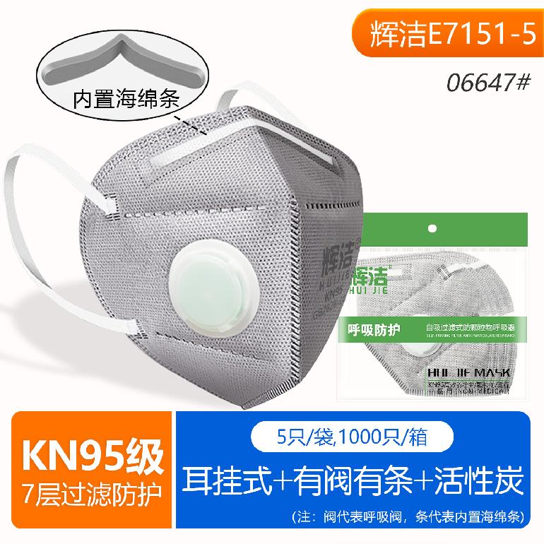 辉洁E7151-5耳挂式.带阀7层★kn95灰炭口罩★5只/装(有内条)