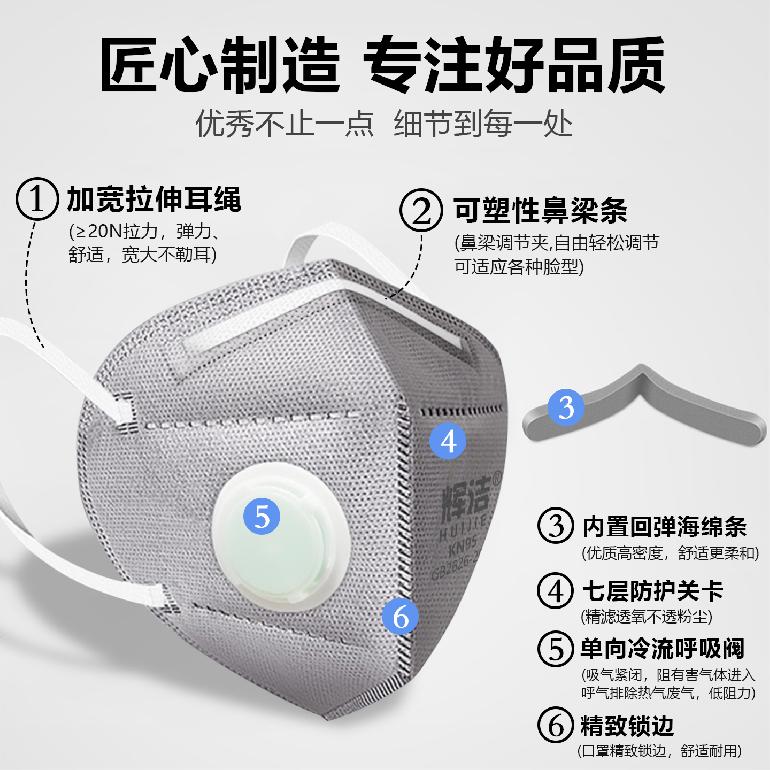 06647#辉洁★灰色活性炭★带呼吸阀★内置海绵条KN95折叠口罩★7层款5只装