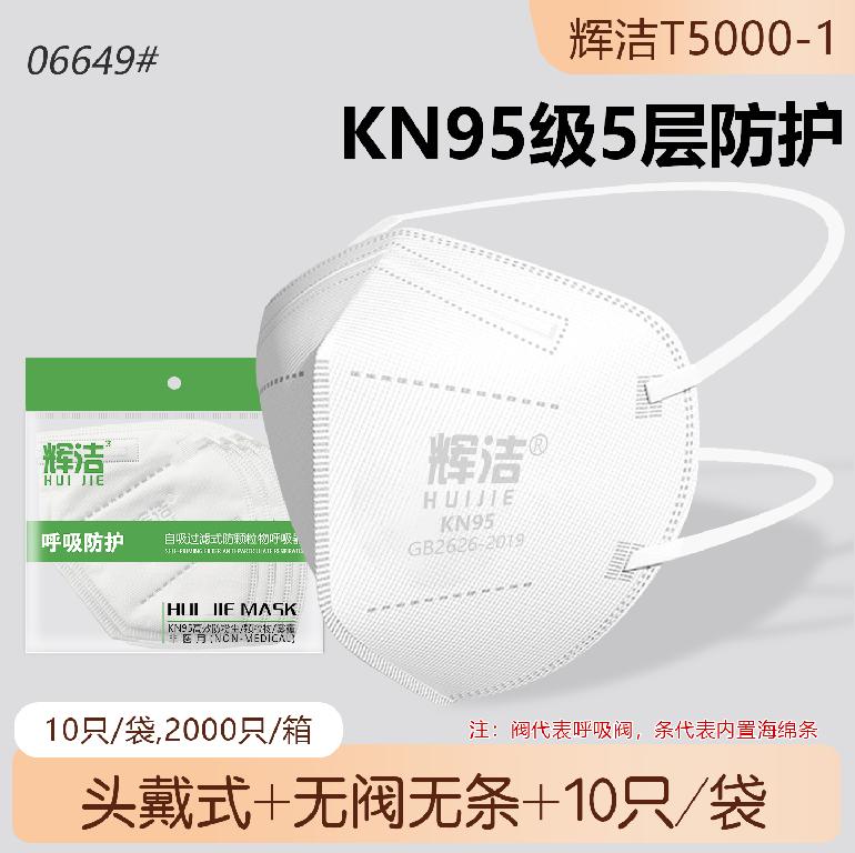 辉洁T5000-1头戴式.无阀5层★kn95白色口罩★10只/装(无内条)