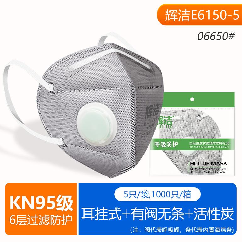 辉洁E6150-5耳挂式.带阀6层★kn95灰炭口罩★5只/装(无内条)