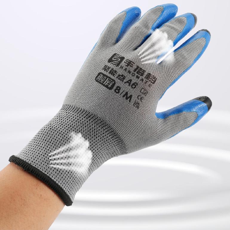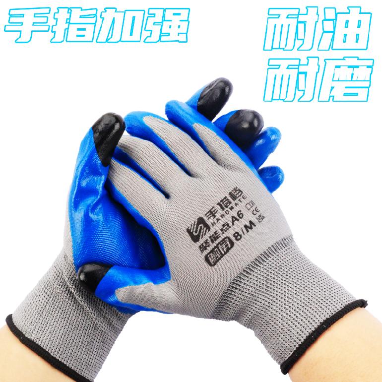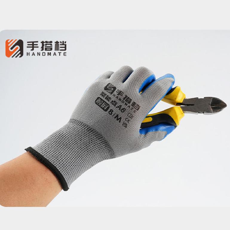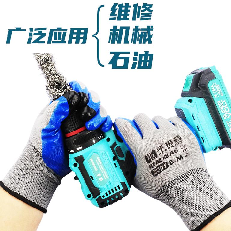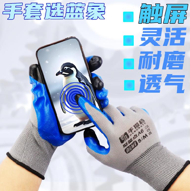 手搭档A6聚能点13针★灰纱蓝胶★丁腈触屏★平挂浸胶手套8# M