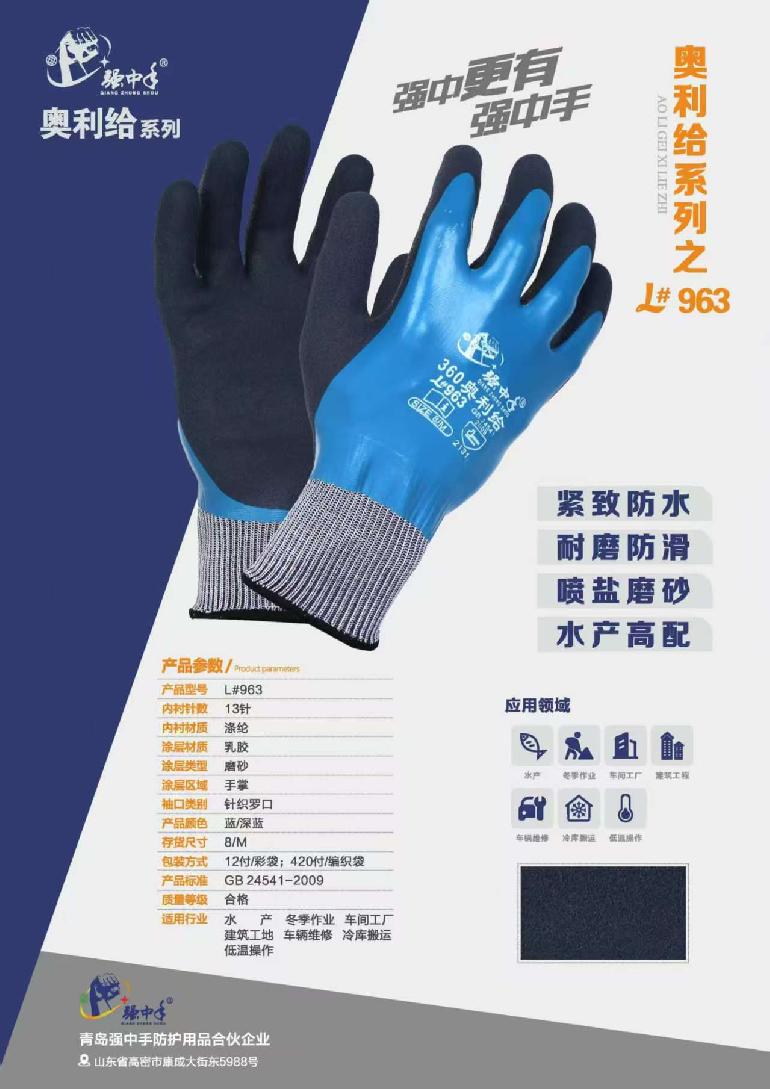 强中手L963★灰纱蓝黑胶★喷盐磨砂★ 两次浸胶满挂手套