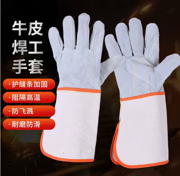 长款帆布接袖二层牛皮电焊手套掌心加固.红包边