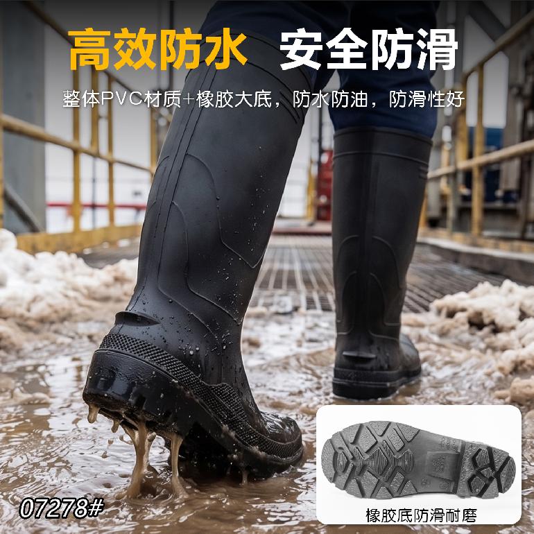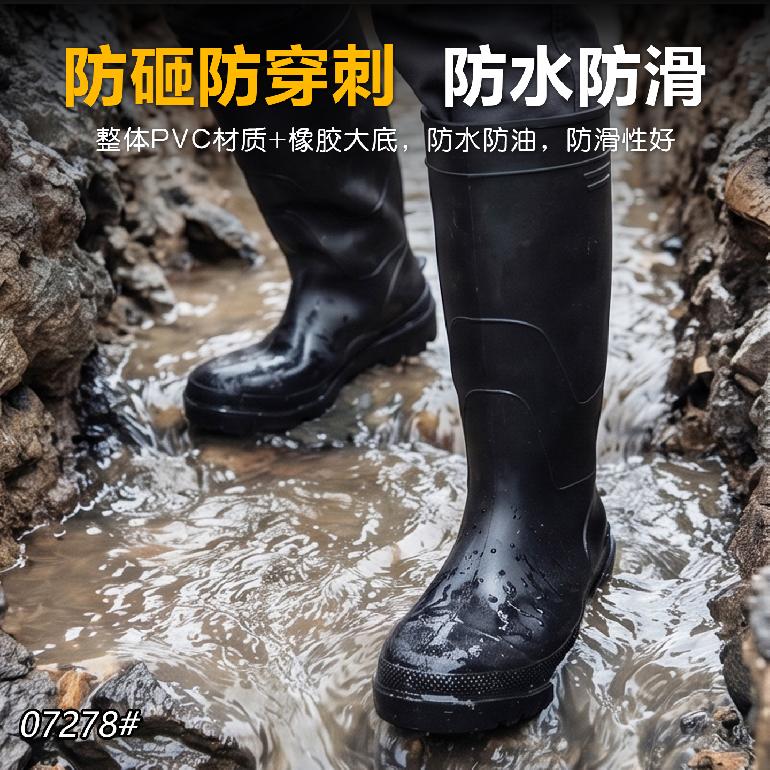 07278#防砸钢头+钢底★38cm高筒38-46#★单雨靴.磨砂黑邦+黑底