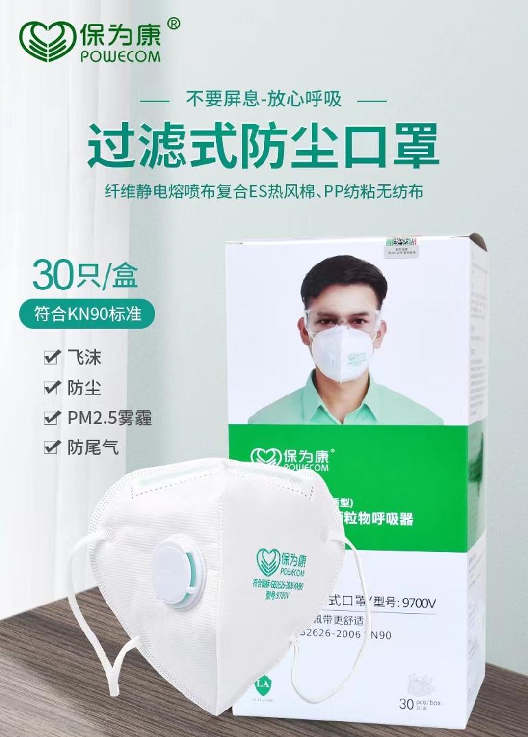 01490# 保为康9700V带阀kn90折叠白色口罩四层,1盒30个.1箱300个, ★ 包装:1盒30个.1箱300个3.95kg 不含税运: >30个1.30元; >300个1.25元; >3000个1.20元 网址:http://www.518laobao.com/html/lb_show.php?fid=1490