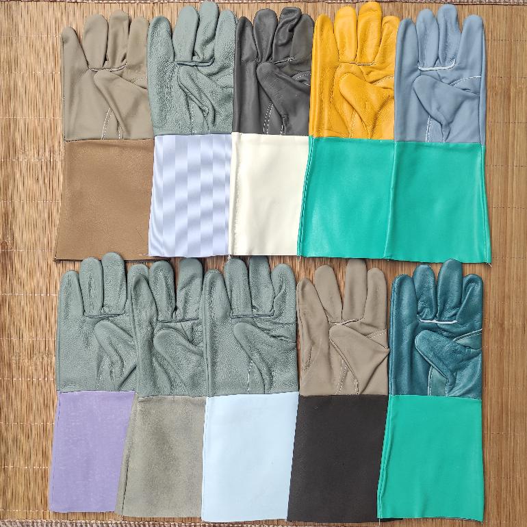 长款头层牛皮+拇指加筋+皮革接袖电焊手套-混色.接指