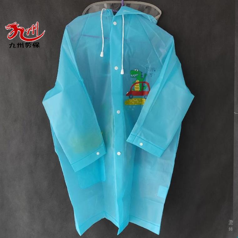 EVA材质,高频热压工艺,双帽檐,袖子丝印印花,单口袋,正面四合扣设计,方便穿脱.