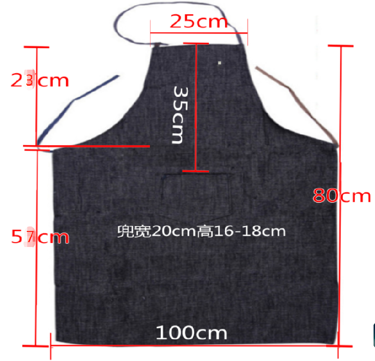定制牛仔布围裙200条 1、成品尺寸:宽100*高80cm 2、上部脖子:宽度26cm 3、侧边高度:54+3=57-58cm 3、上部绳子:下料长 59cm 成品55-56cm± 4、居中单兜: 看图