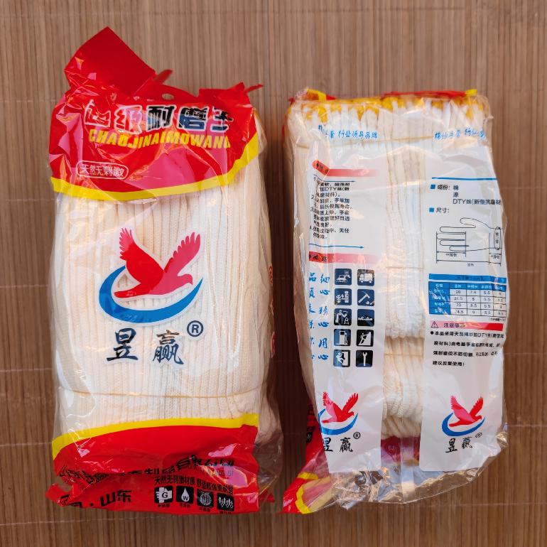白纱昱赢12双600g十针棉盖涤手套★彩袋装720双装/黄边