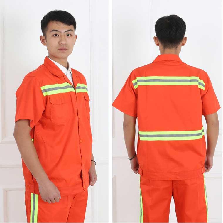 夏季短袖桔色分体套装工作服6535涤棉-前单后双反光条 反光条:前单反光条 后双反光条 面料:涤65% 棉35% 样式:小领口 带扣