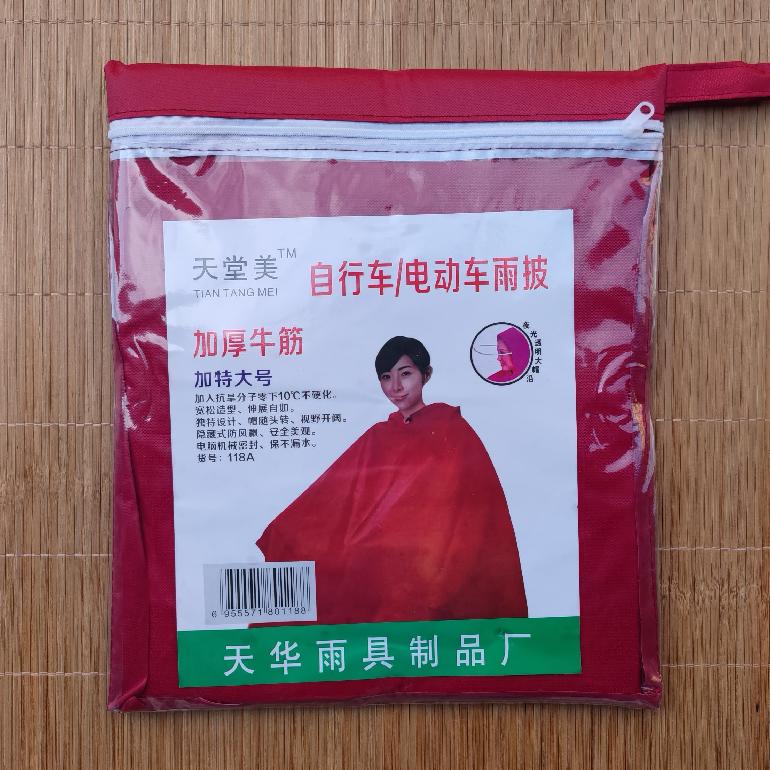 04985# 单人车衣★天堂美118A★自行车/电动车通用雨衣★加厚牛津布(大红/枣红/军绿/玫红), ★ 包装:80个/箱 不含税运: >5个12.0元; >80个11.5元; >800个11.0元 网址:http://www.518laobao.com/html/lb_show.php?fid=4985