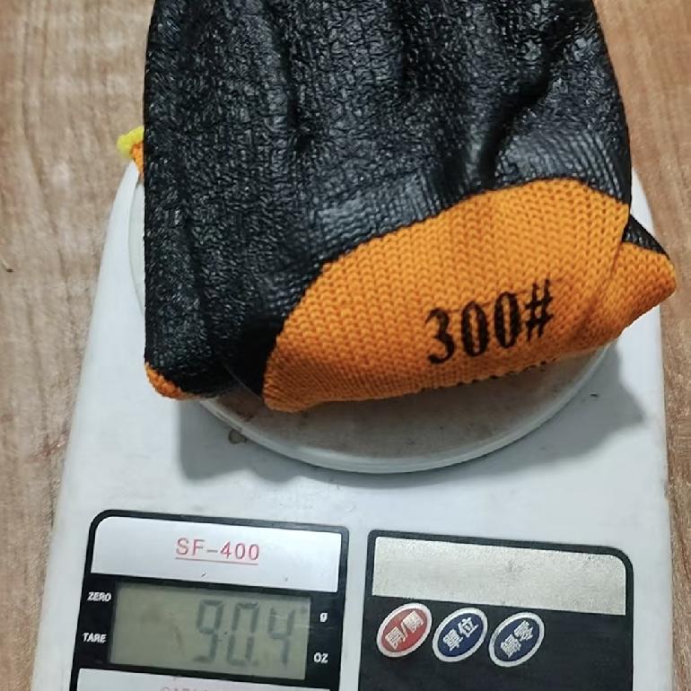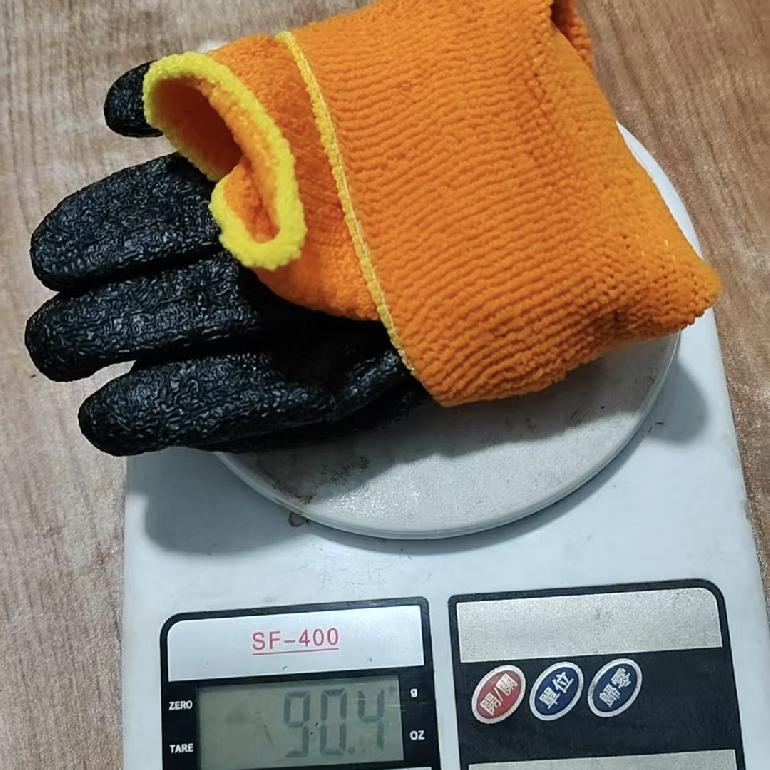 鲁坤桔纱黑毛圈乳胶皱纹全挂浸胶手套 90g