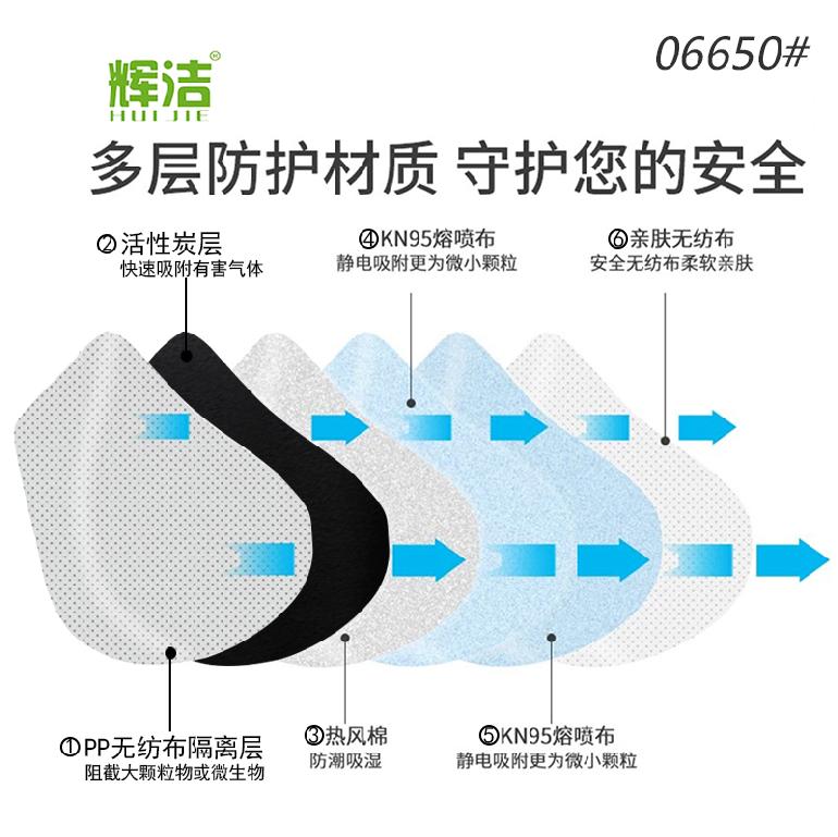 06650#辉洁★灰色活性炭★带呼吸阀KN95折叠口罩★6层款5只装 包装:5只/包 1000只/箱 口罩层数:6层款 箱尺寸:68*34*46CM 箱重量:9.6kg
