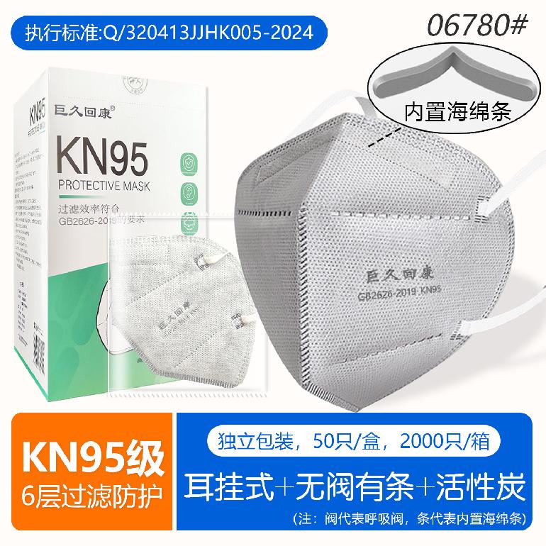 06780#企标巨久回康★耳挂式.无阀6层★kn95灰色活性炭口罩★50只/盒(有内条) 执行标准:Q/320413JJHK005-2024 箱尺寸:66*63*49cm 数量:独立装 50只/盒 2000只/箱 克重:6g±/只 409.3g±/盒