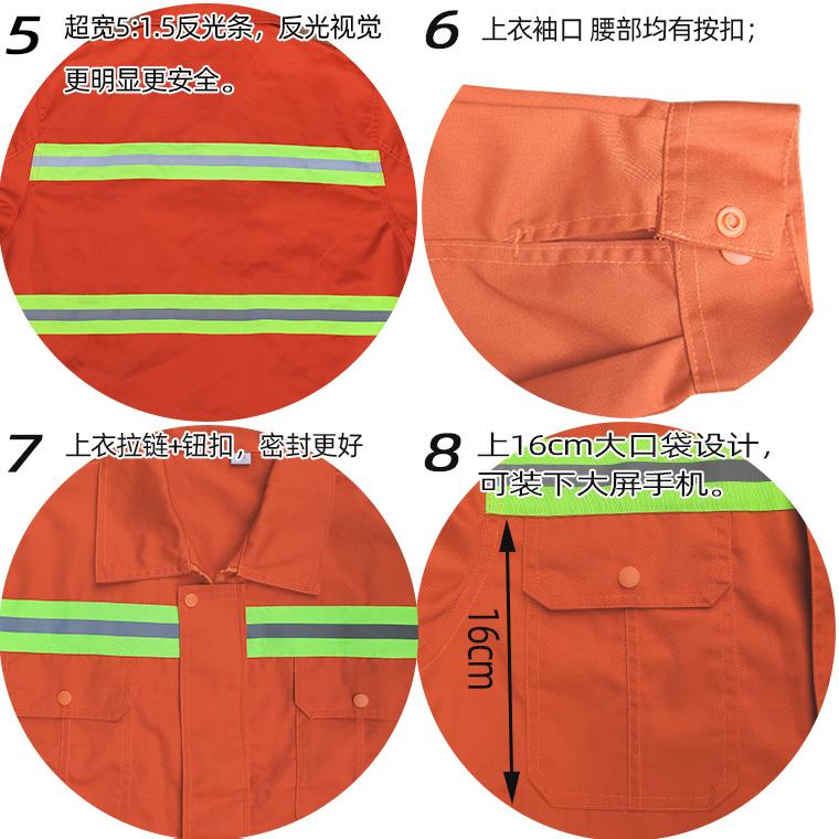 0688#桔色环卫分体工作服8020涤棉160-190#16大亮点 01、采用8020涤棉,结实耐磨; 02、重叠处全加固,耐拉不开线; 03、全工艺锁边/缝合,美观上档次; 04、码号160-190多码可选,还可定制; 05、超宽5:1.5反光条,反光视觉更明显; 06、上衣袖口 腰部均有按扣; 07、上衣拉链+钮扣,密封更好; 08、上衣双大口袋,可装大屏手机; 09、上衣内置大口袋,里外都可装物品; 10、上衣侧面双口袋25*30cm,更大更深; 11、上衣前单后双反光条,外加胳膊反光条; 12、上衣前后,可印Logo; 13、双裤腰鼻,更牢固耐拉; 14、裤裆、裤腰鼻、口袋全加固; 15、裤腿侧双面长反光条,视觉更美观; 16、裤腰两侧均有松紧皮筋,可调节尺寸;